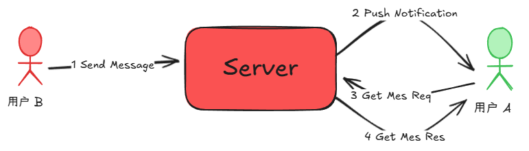 推拉结合模式:有新消息时,服务器会先推一个有新消息的通知给前端,前端接收到通知后就向服务器拉取消息。