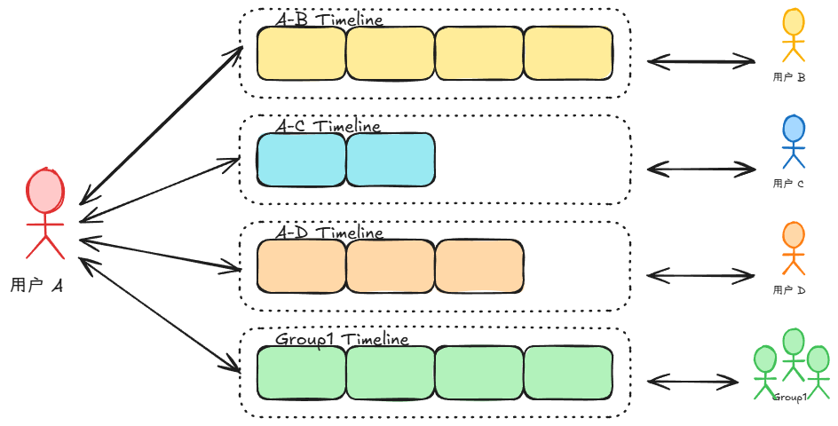 A 与每个聊天的人跟群都有一个 Timeline,A 再查看聊天信息的时候需要读取所有有新消息的信箱。
