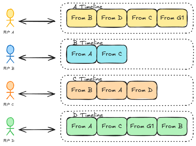 A 与每个聊天的人跟群都有一个 Timeline,A 再查看聊天信息的时候需要读取所有有新消息的信箱。
